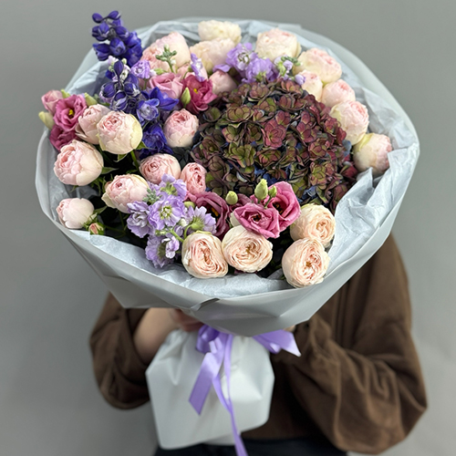 Букет "Бергамот" из Голландской гортензии, кустовых пионовидных роз Мэнсфилд парк, ароматных маттиол, дельфиниума и эустом