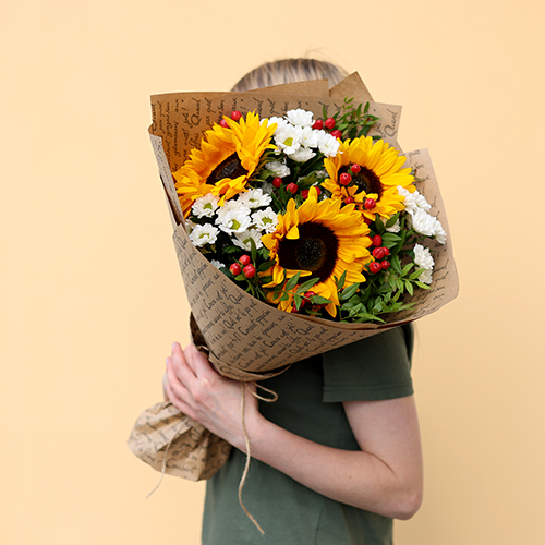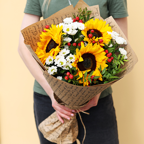 Букет подсолнухов, хризантем сантини и ягодами гиперикума