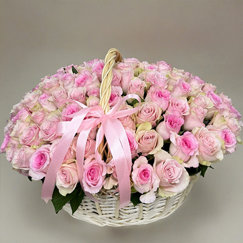 Композиция в корзине из 101 кенийской розы нежный микс (40 см)